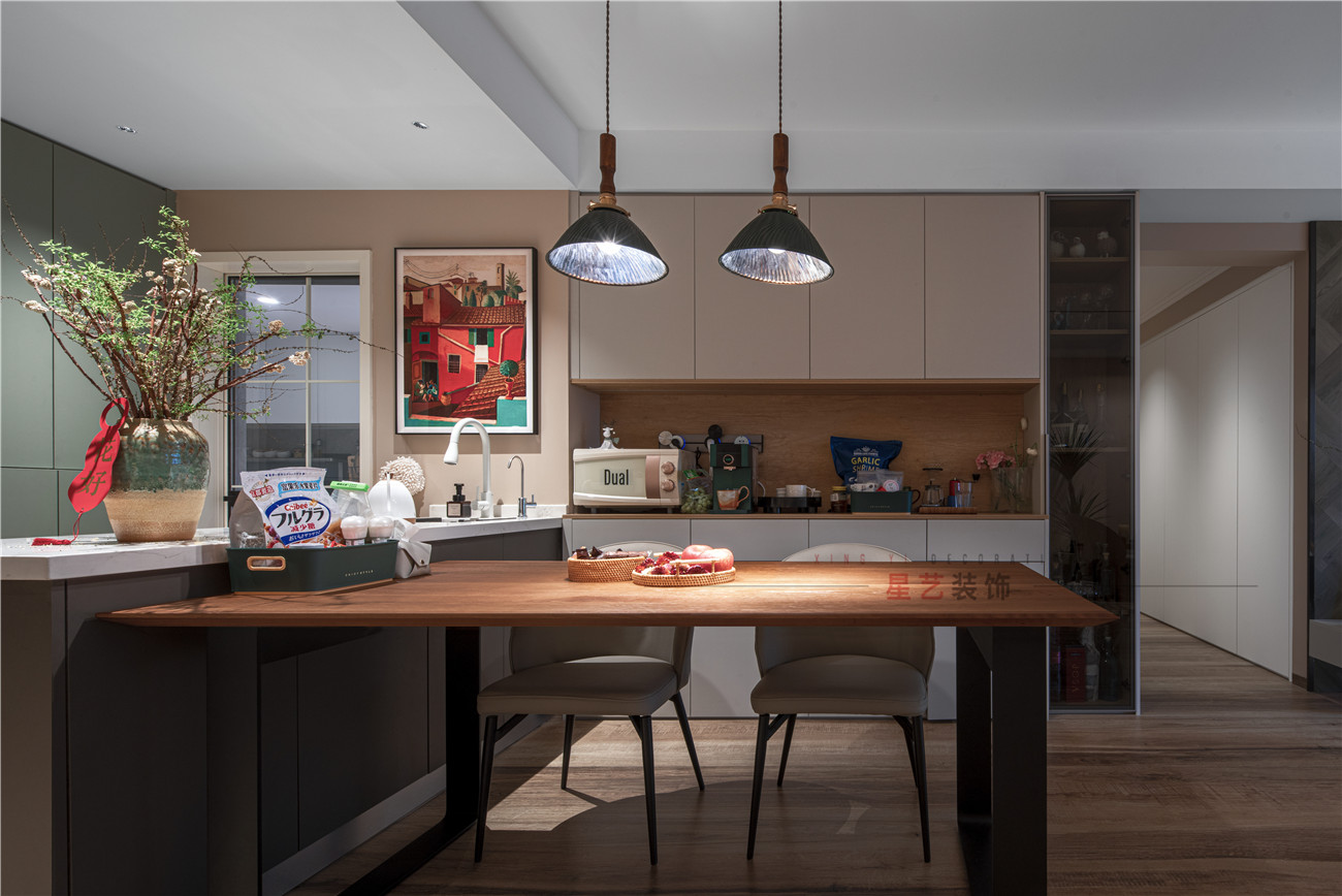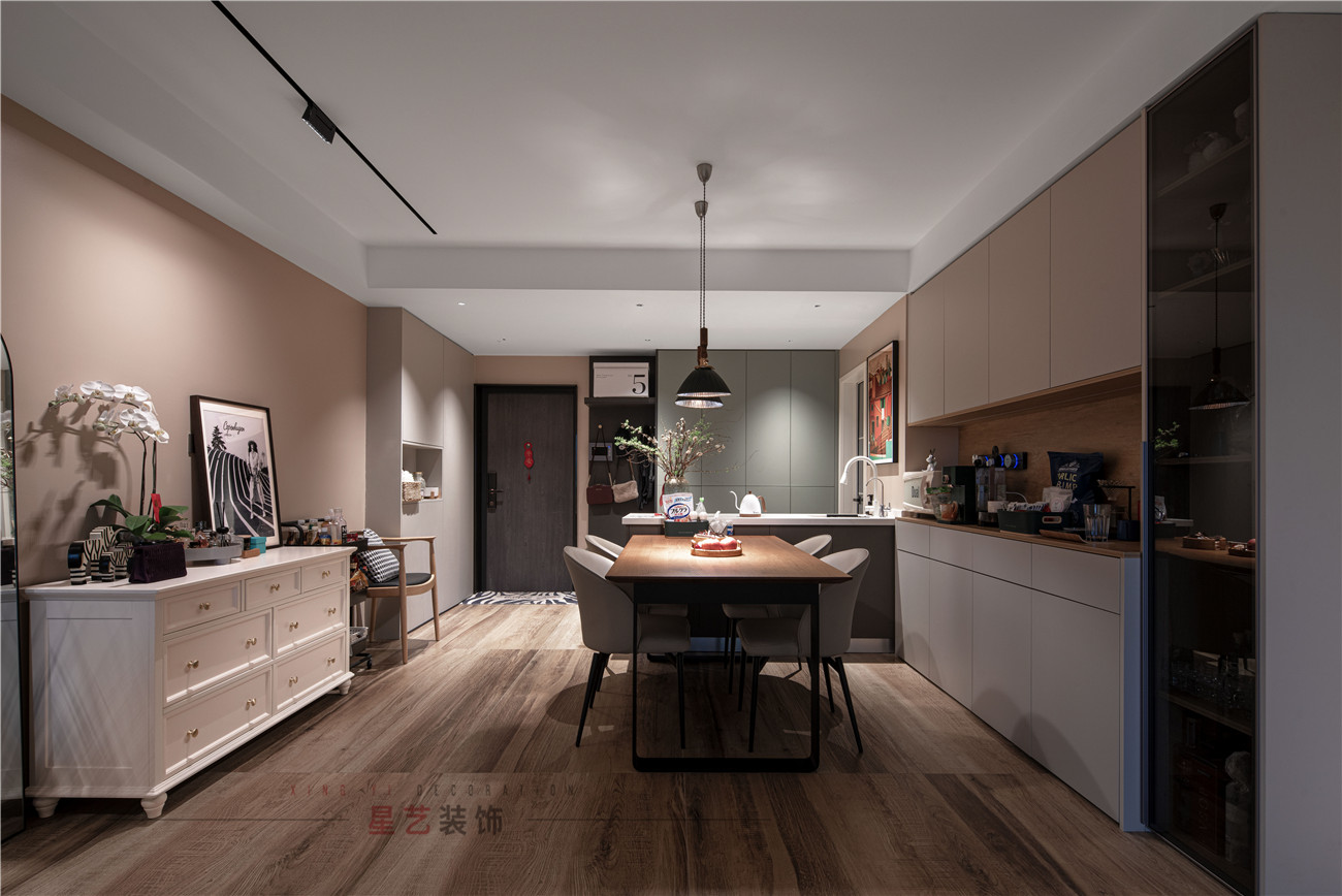 餐廳部分也是個(gè)多功能區(qū),設(shè)置了大量的儲(chǔ)物柜,用餐區(qū)采用吧臺(tái)的設(shè)計(jì),連接洗手臺(tái),最大程度的節(jié)省了空間,內(nèi)嵌的置物臺(tái)也可以作為茶水區(qū),便利了生活又恰到好處。