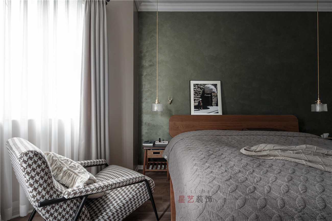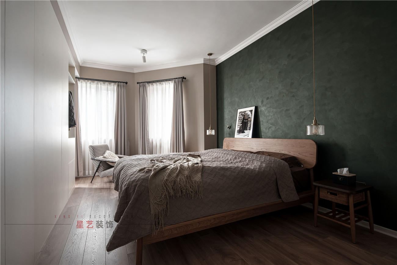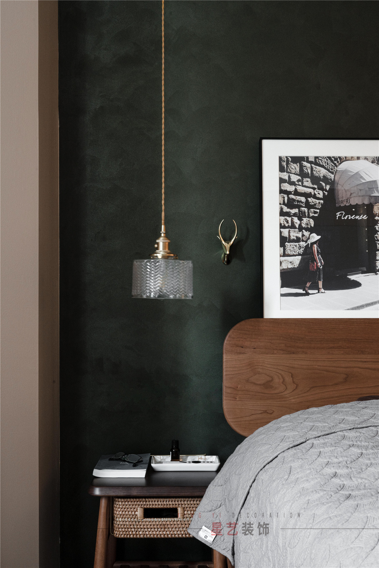 臥室用大面積的墨綠色背景奠定了整體的色彩基調(diào),不規(guī)則的房型設(shè)計(jì),編織收納籃,和鹿形裝飾讓整個(gè)房間都顯得獨(dú)特又靈動(dòng),同時(shí)兼具成穩(wěn)與大氣,這也是設(shè)計(jì)師的獨(dú)具匠心之處。