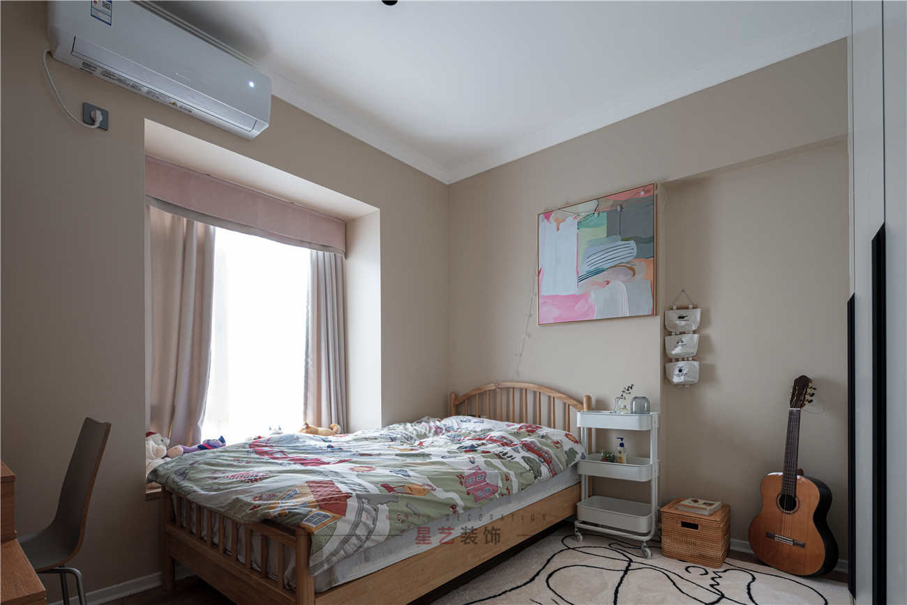兒童房用撞色元素搭配出豐富童心世界,收納移動(dòng)架代替床頭柜,孩子的玩具和生活用品都可以合理分配放置。