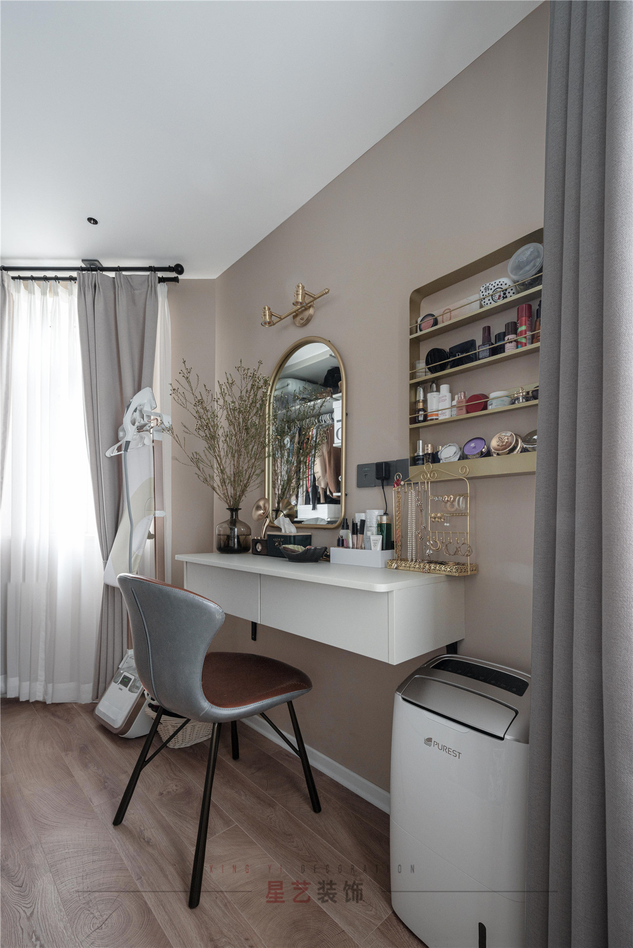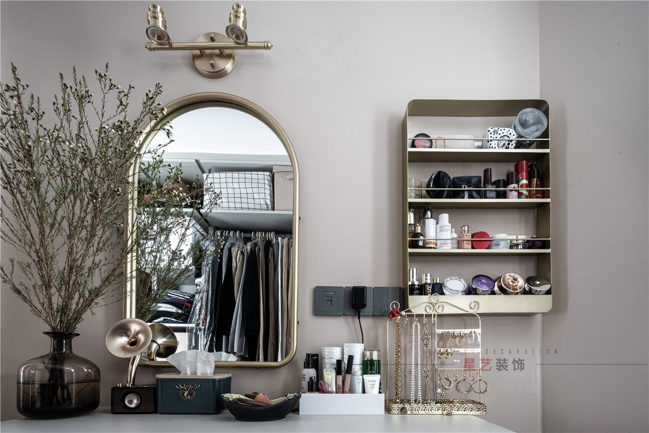 極具北歐風(fēng)格設(shè)計(jì)的梳妝臺(tái)也是一大亮點(diǎn),以白墻為底,搭配金色置物架和飾品架顯得高格調(diào)還不會(huì)太夸張,懸空的白色桌柜也讓業(yè)主能使用的更加舒適,看著美觀又節(jié)約空間。