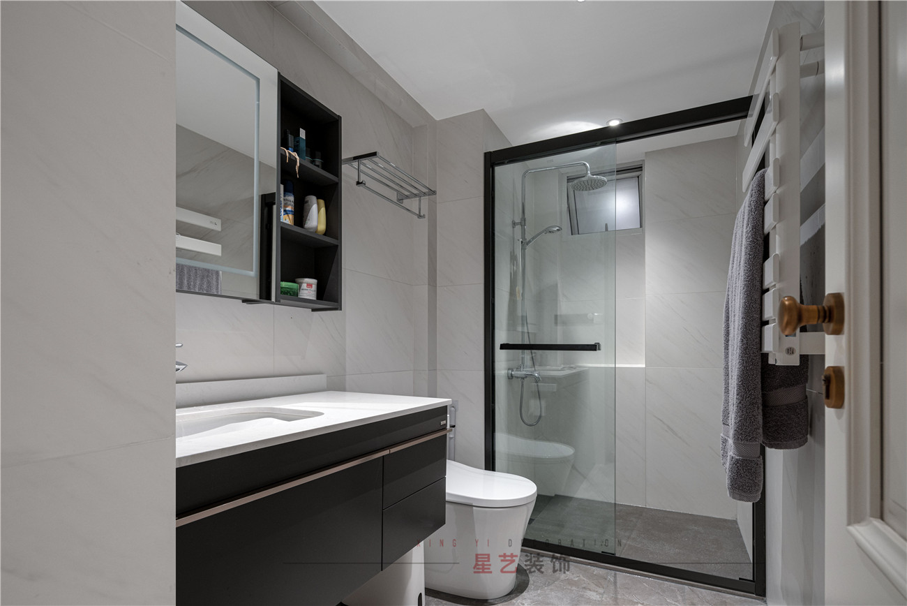 衛(wèi)生間則是偏向現(xiàn)代風(fēng)格的簡(jiǎn)約設(shè)計(jì),整體采用黑白灰的搭配,設(shè)置單獨(dú)的淋浴區(qū),干濕分離。