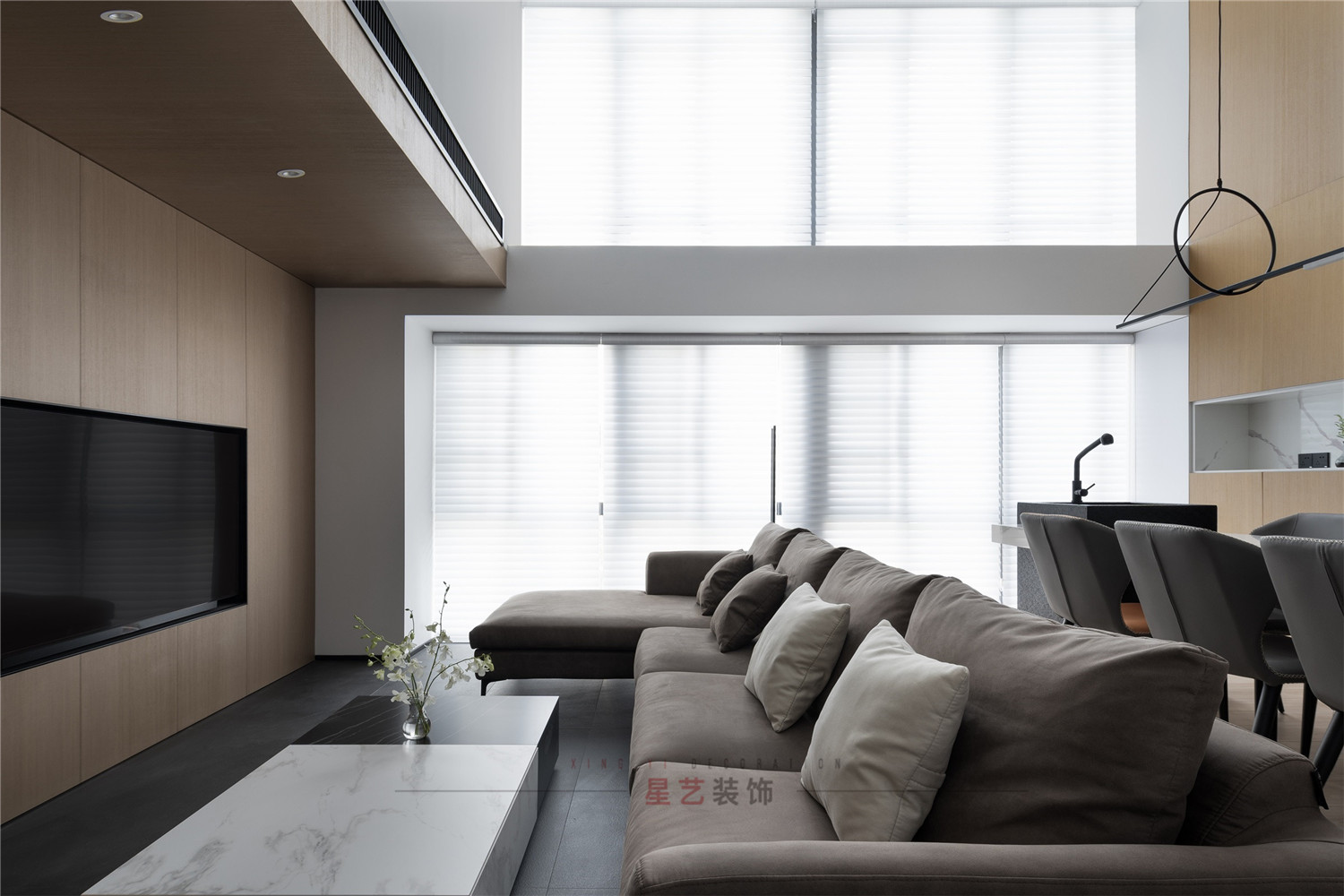 客廳:簡潔的設計,大面積的百葉窗制造極好的光影效果,不管任何天氣都擁有最佳的采光,內嵌的電視機搭配下沉式空間的處理手法帶給業主沉浸的舒適體驗,主色調黑白灰,在各個區域中都有獨立的對應系,精簡而規整,大方而得體。