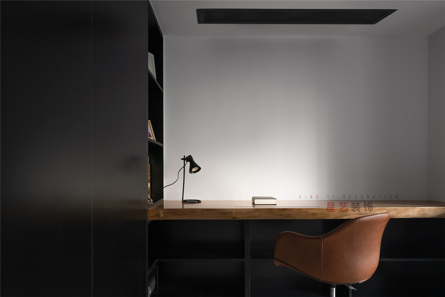 書房是給人思考的寂靜之地,斑駁的光影給這個角落帶來勃勃生機,大面積的黑色書柜和原木色桌椅相結合,似乎在這個地方可以隔離一切塵世喧囂。