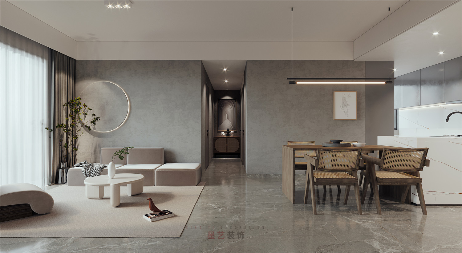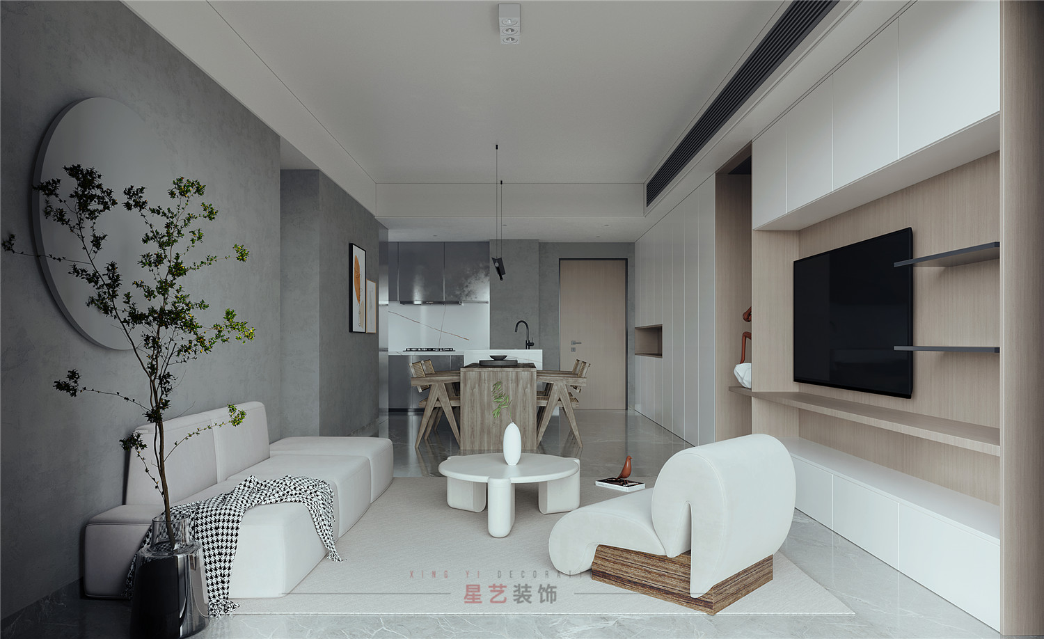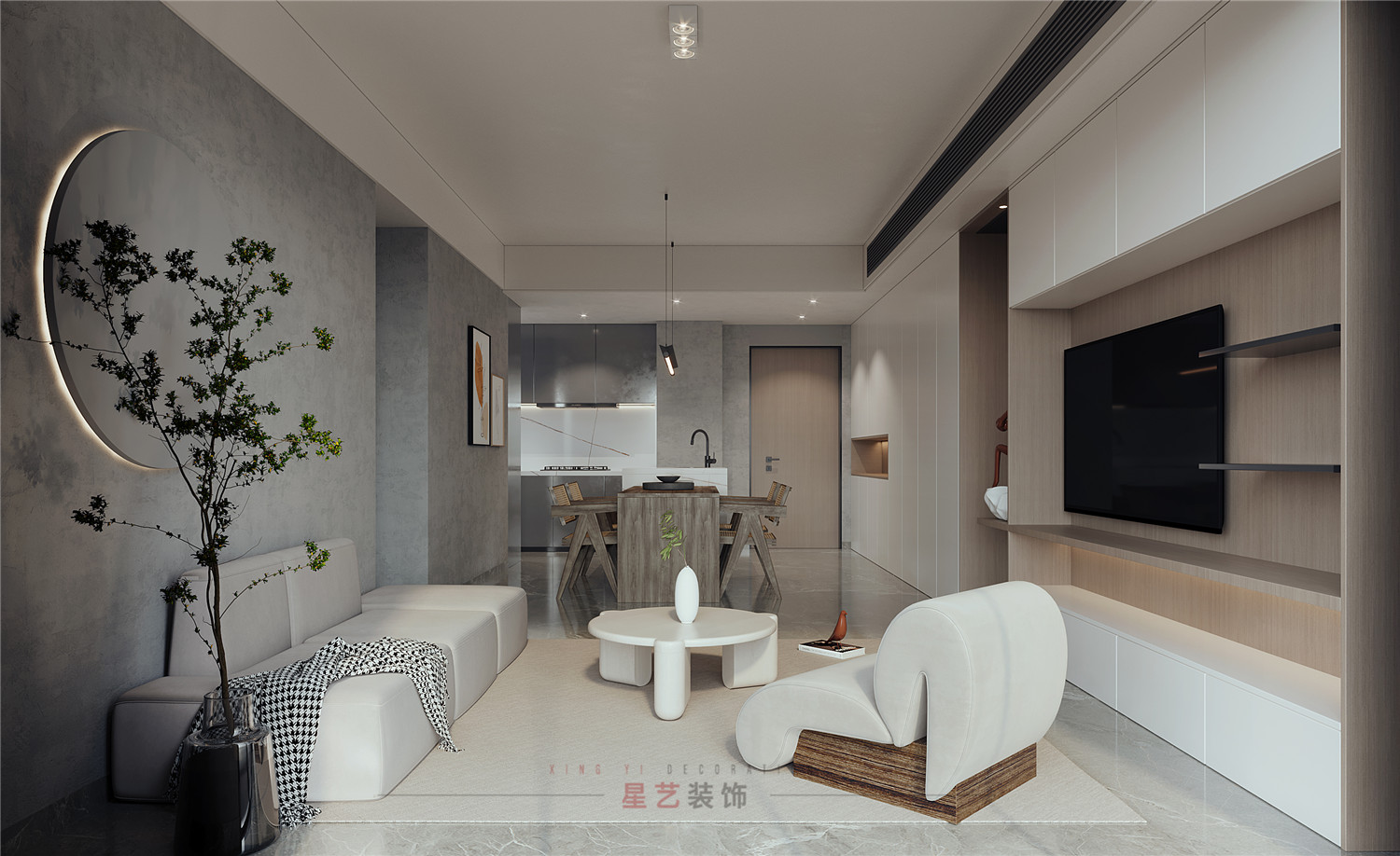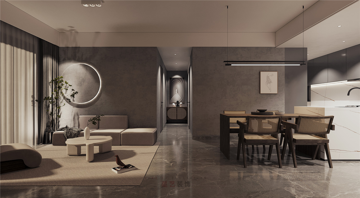 休息區主要用黑白灰的搭配設計出舒適又靜謐的空間,尤其灰色墻面凸出的圓形木藝設計,搭配燈帶像是一輪明月,在綠植的稍稍遮擋下形成了絕美的畫卷,猶如身處閑庭雅居,與最愛的人一起看花開花落。