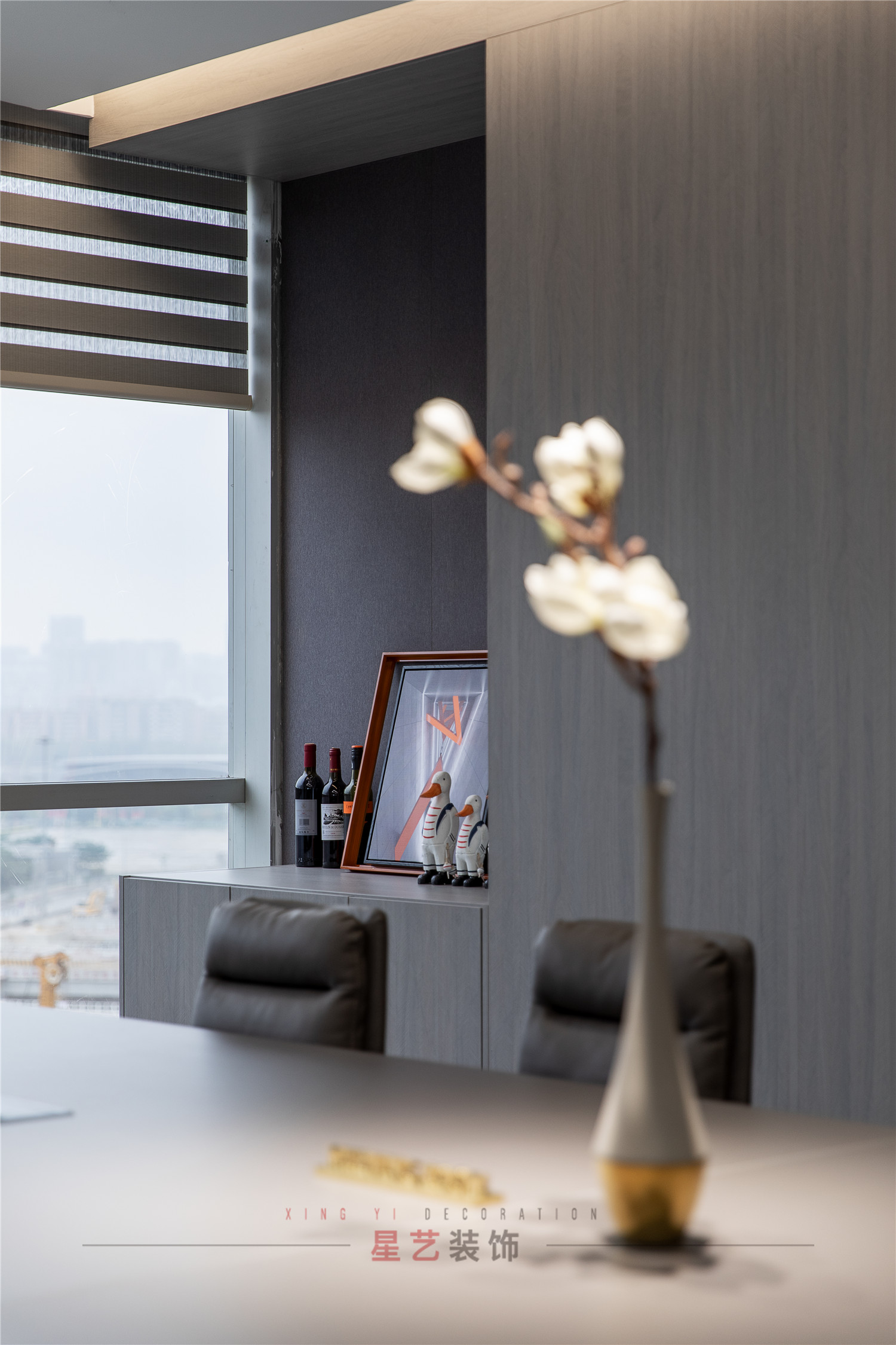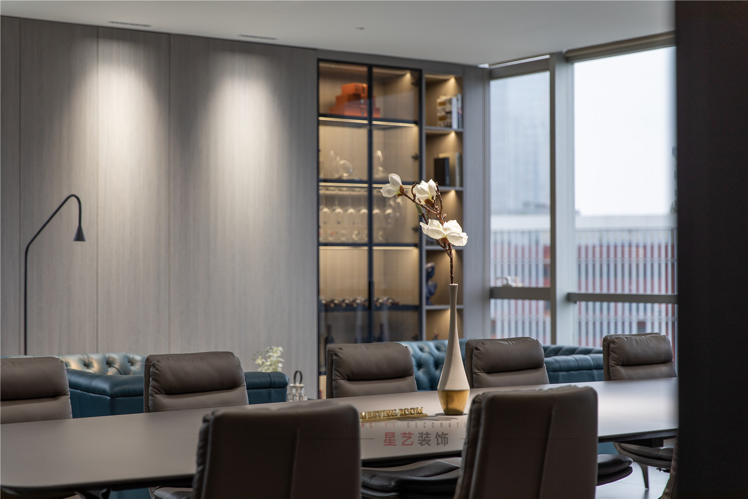 會(huì)議區(qū)也可作為接待區(qū),休息區(qū),學(xué)習(xí)區(qū),隱形儲(chǔ)物柜實(shí)用又美觀,整面的落地窗讓整個(gè)空間干凈明亮,既能享受家的愜意,也能減少工作帶來(lái)的的浮躁與不安。