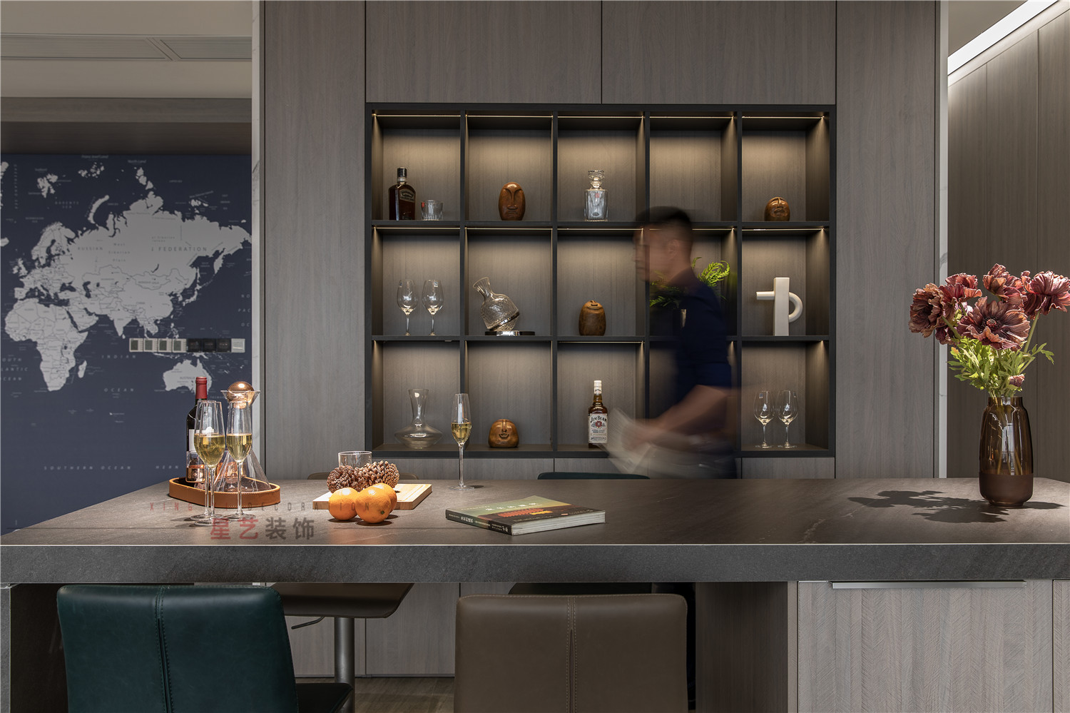 水吧部分直接設(shè)計(jì)了酒水柜,并且暖色的燈光直接把氛圍感拉滿,在休息時(shí)間也能感受溫馨浪漫的環(huán)境。