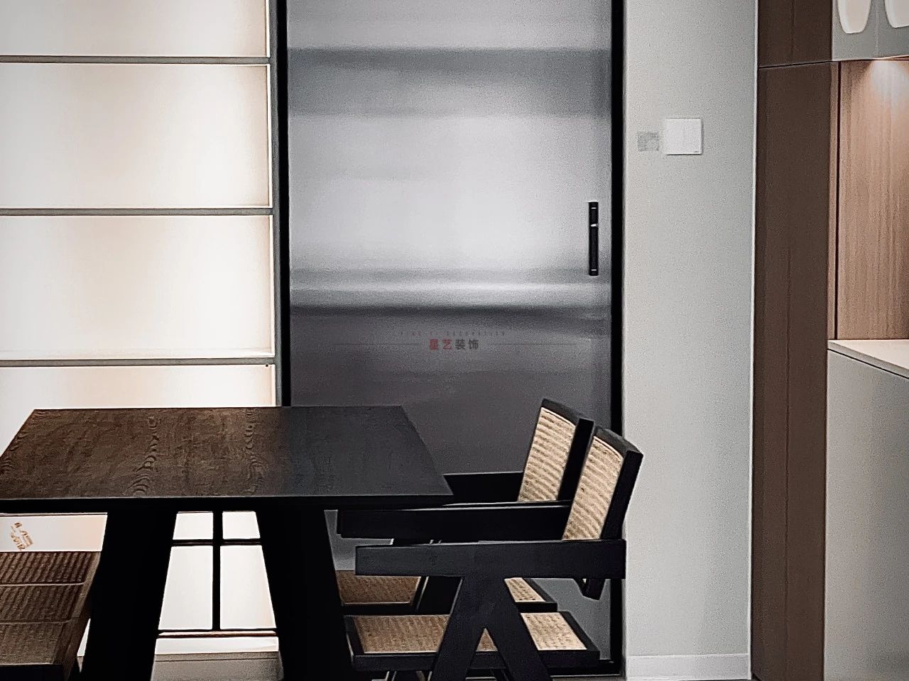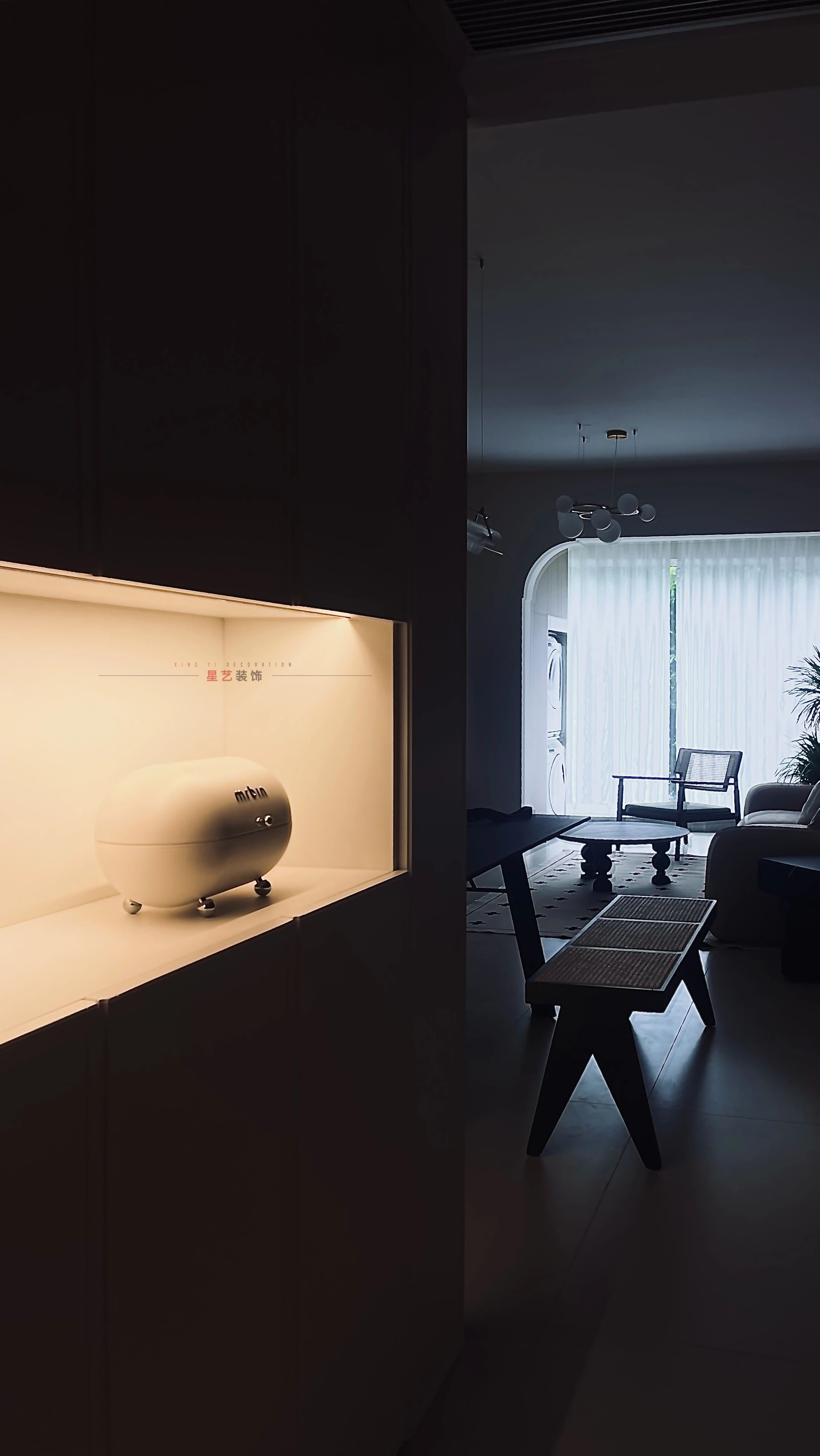 玄關柜上暖黃色的燈,與窗外模糊的暮色形成對比,這是一天最溫柔的時刻,光讓生活浮起來了。